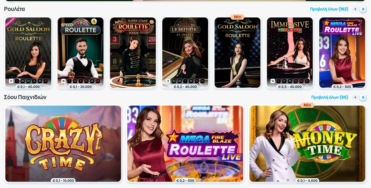 Προσφέρουμε επίσης ειδικά παιχνίδια όπως το "Lightning Roulette" και το "Crazy Time" που προσθέτουν έναν επιπλέον ενθουσιασμό στην εμπειρία του live casino.
