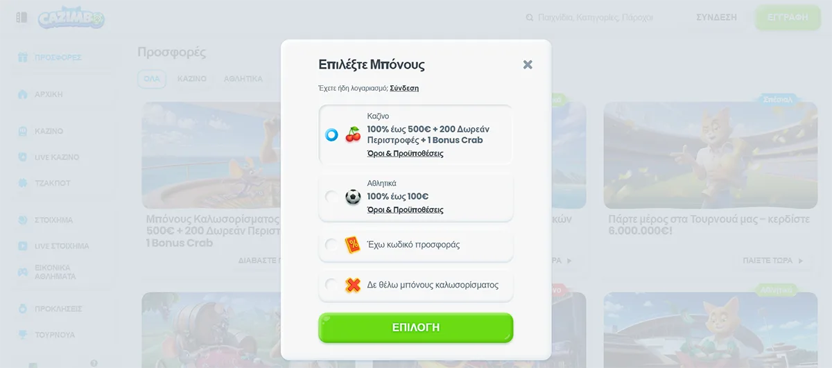 Εγγραφή και Cazimbo Login
